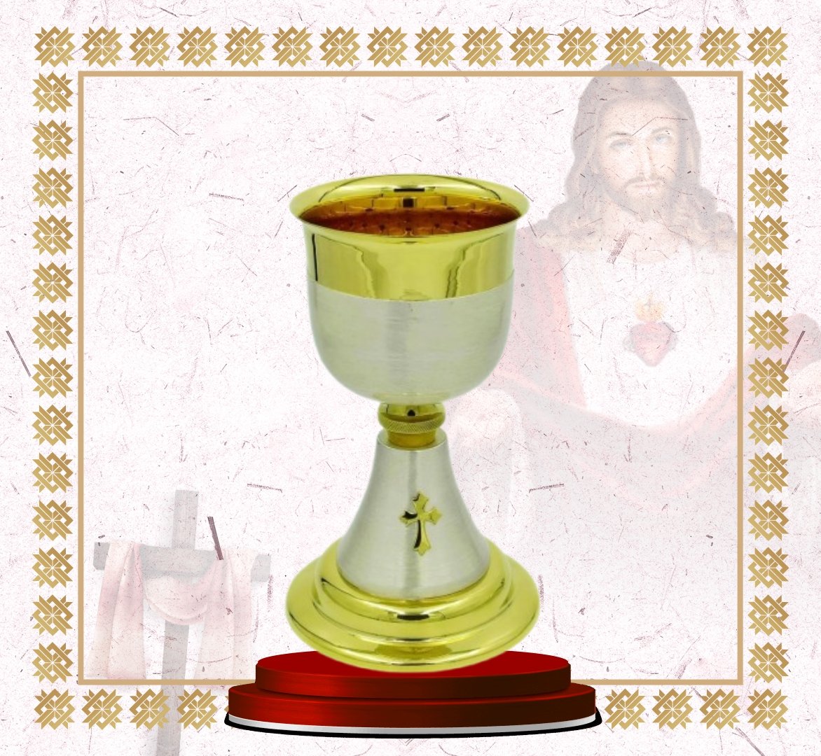 This refined chalice and paten set is crafted from solid brass and finished with a radiant gold-plated interior and polished silver exterior. The chalice features a simple cross engraving on the base, symbolizing faith and reverence. Its balanced design ensures stability during liturgical celebrations, while the matching paten provides a practical and elegant companion for Eucharistic use. Built for durability and frequent use, this set is ideal for parish churches, chapels, and devotional gatherings, offering a perfect blend of simplicity, beauty, and sacred function.