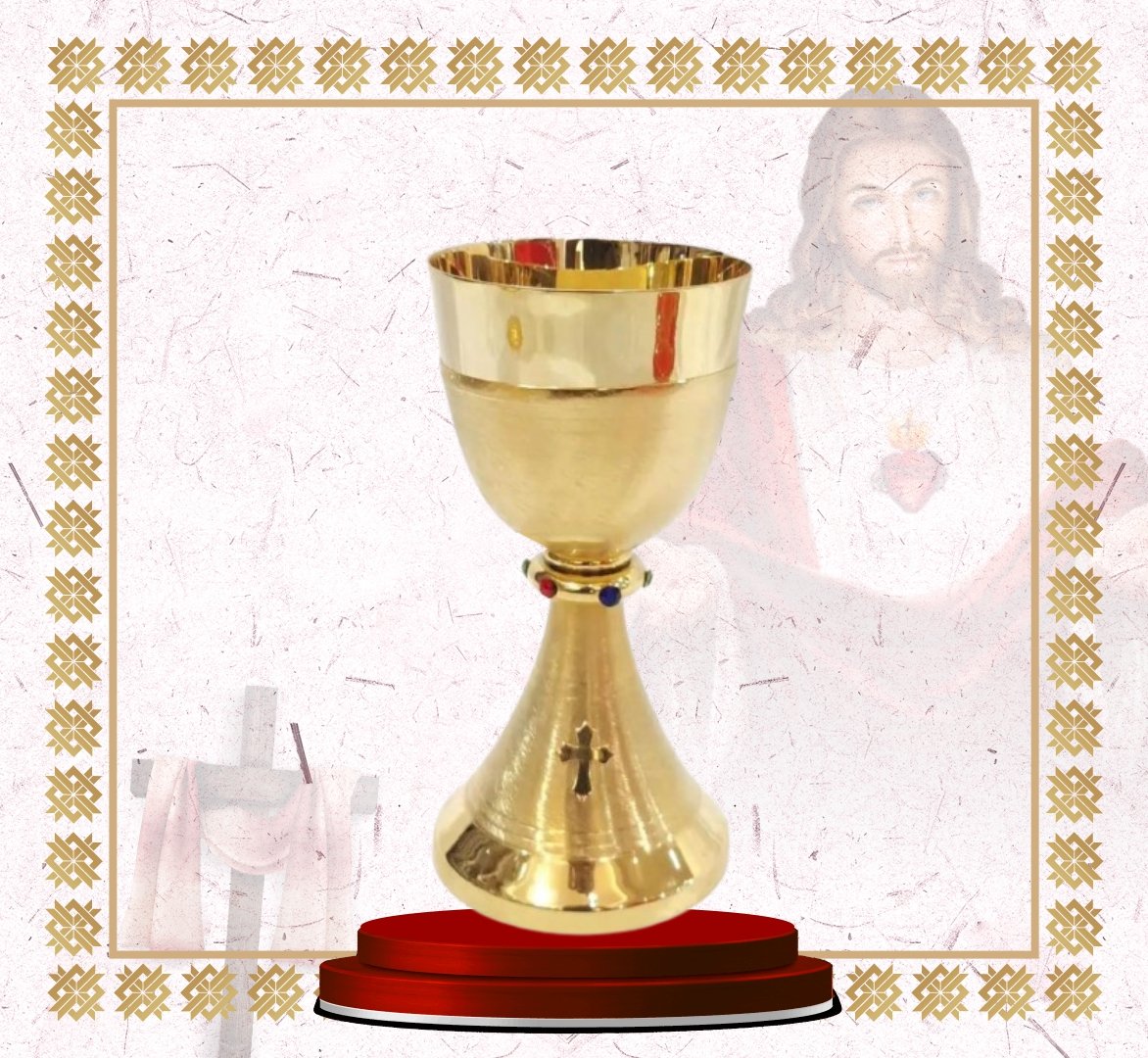This elegant chalice and paten set is crafted from solid brass with a radiant gold-plated finish. The chalice features a finely engraved cross on the base and decorative gemstone accents around the stem, symbolizing beauty and devotion. Its polished interior ensures suitability for Eucharistic use, while the matching paten complements the set with simplicity and elegance. Built for durability, this set is ideal for parish churches, chapels, and liturgical celebrations, blending traditional sacred artistry with practical functionality.