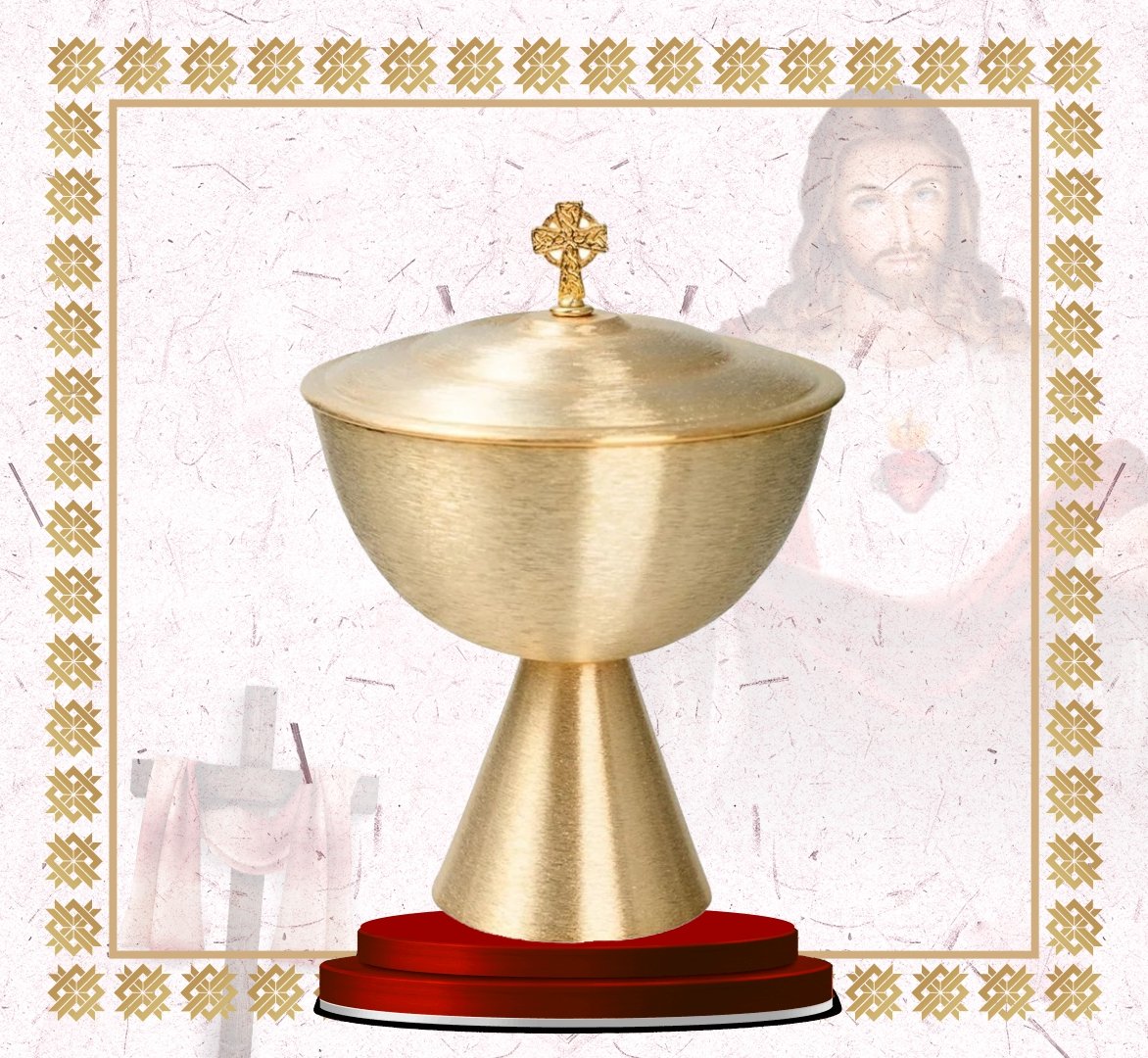 This ciborium is crafted from high-quality brass and richly plated in gold, designed to securely hold consecrated hosts during the Holy Eucharist. Its smooth, polished finish and elegant shape symbolize reverence and dignity, while the finely detailed cross on the lid reflects devotion and sacred tradition. Built with sturdy construction, it ensures long-lasting use during Mass and other liturgical celebrations. Ideal for parish churches, chapels, and devotional institutions, this ciborium combines both functionality and timeless elegance.