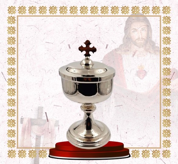 This ciborium is crafted from high-quality brass and finished with a polished nickel plating, giving it a bright and dignified appearance. Designed to reverently contain and safeguard consecrated hosts, it features a secure lid adorned with a cross, symbolizing the sacred presence of Christ in the Eucharist. The sturdy stem and base provide stability, while the smooth reflective finish enhances its aesthetic appeal during liturgical celebrations. Durable and practical, this ciborium is ideal for both parish use and institutional worship, ensuring reverence and functionality for Holy Communion.