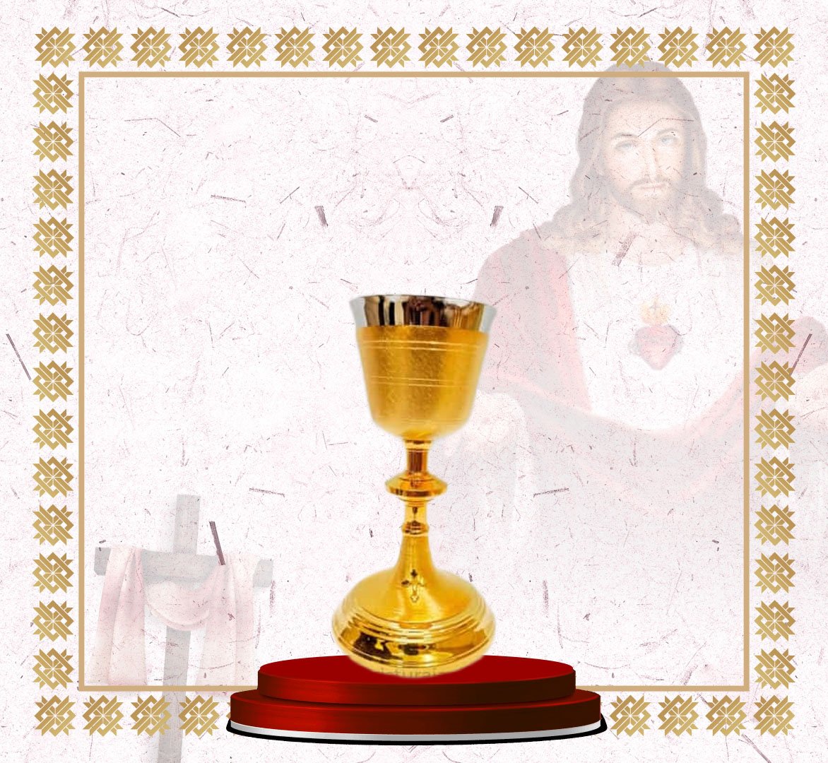 This classic gold chalice combines traditional design with fine craftsmanship. The upper bowl showcases elegant texturing that enhances its radiant gold finish, while the smooth, sturdy stem and base provide perfect balance and grip during liturgical services. The interior is lined with a polished finish to ensure reverence and purity during Communion. Ideal for churches seeking a timeless and dignified vessel for the Eucharist.