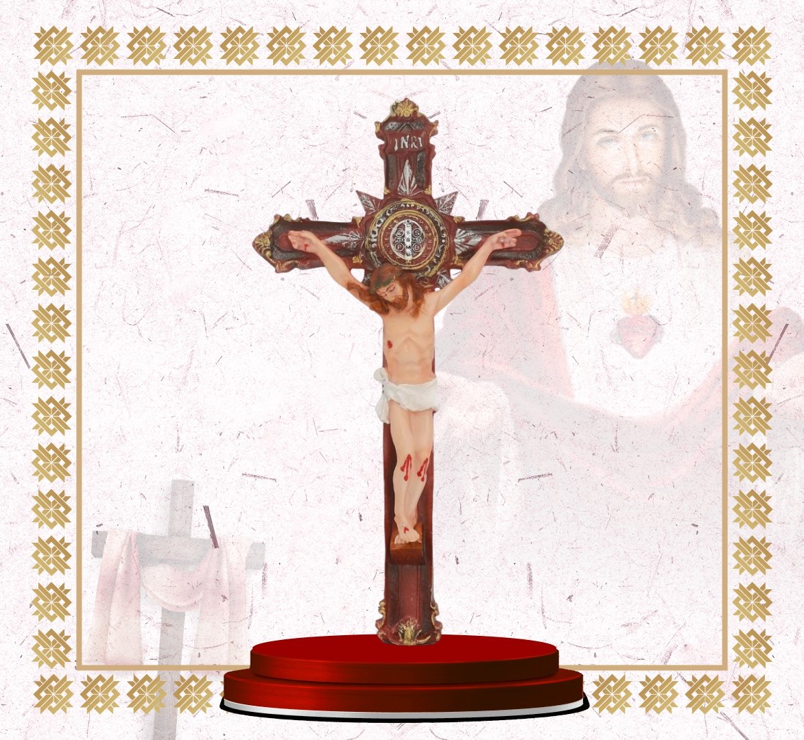 This 10-inch Crucifix is intricately designed to capture the solemn beauty of Christ’s crucifixion. Crafted from durable polyresin and hand-painted with precision, it features realistic details and a classic wood-tone cross with golden accents. A central Saint Benedict medal adds a spiritual layer of protection and devotion. Ideal for homes, churches, or personal chapels.