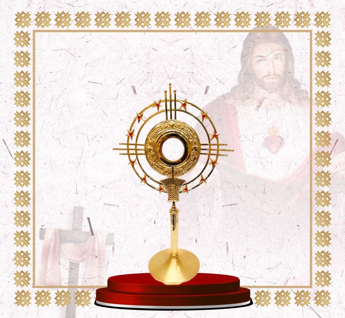 This stunning gold monstrance beautifully captures the essence of devotion and divine reverence. The circular frame, surrounded by symmetrical cross-ring beams, highlights the central area designed to display the consecrated Host. Subtle red accents accentuate its intricate craftsmanship, while the floral base provides both aesthetic grace and structural balance. Ideal for adorations, processions, and altar display, this monstrance combines traditional symbolism with refined artistry to honor the Blessed Sacrament.