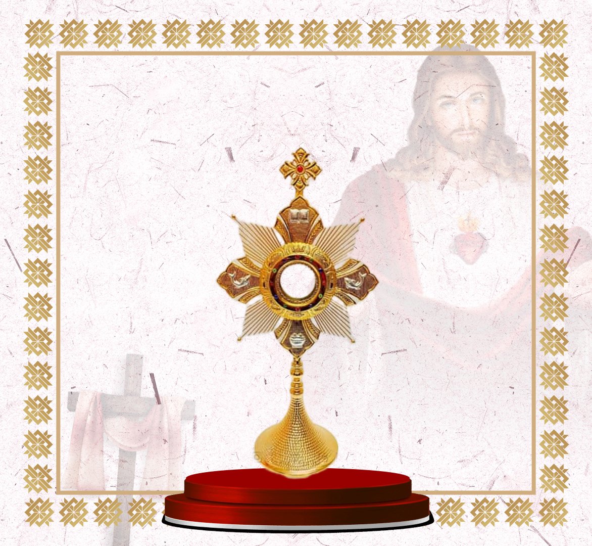 This elegant gold monstrance features a unique floral-petal inspired design, with a central circular holder for the Blessed Sacrament surrounded by ornate rays and fine engravings. A cross finial tops the piece, while the textured gold base adds balance and grace. Perfect for solemn adoration and church display.