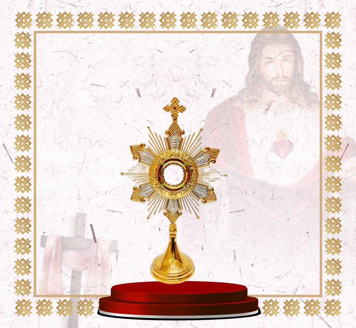 This stunning monstrance features a cross-shaped design with radiant sunburst rays, combining intricate silver and gold tones for a magnificent liturgical presence. The circular glass luna at the center holds the Blessed Sacrament securely for exposition and adoration. Crowned with a delicate cross and balanced on a polished gold base, it embodies both elegance and devotion, making it an ideal choice for church use or chapel worship.