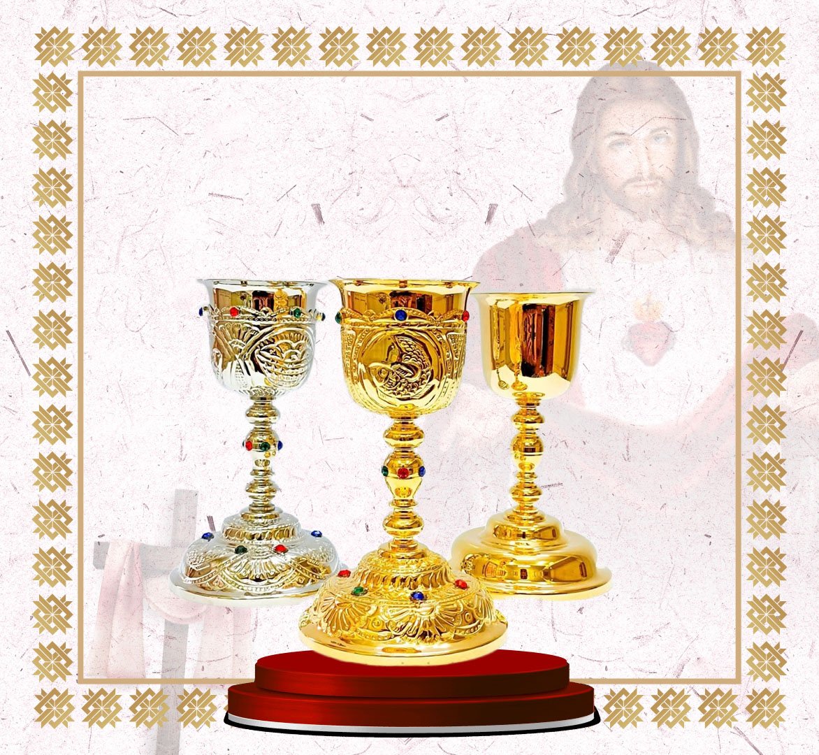 This Jeweled Chalice Set represents a blend of sacred artistry and craftsmanship. Each chalice is designed with intricate floral engravings and embedded with multi-colored stones symbolizing the graces of the Holy Spirit. The collection includes gold-plated, silver-plated, and antique-finish chalices, providing versatility for various liturgical settings. The interior of each chalice is lined for safe liturgical use and durability. These exquisite pieces are suitable for Mass, ceremonial processions, or as a meaningful gift for priests.