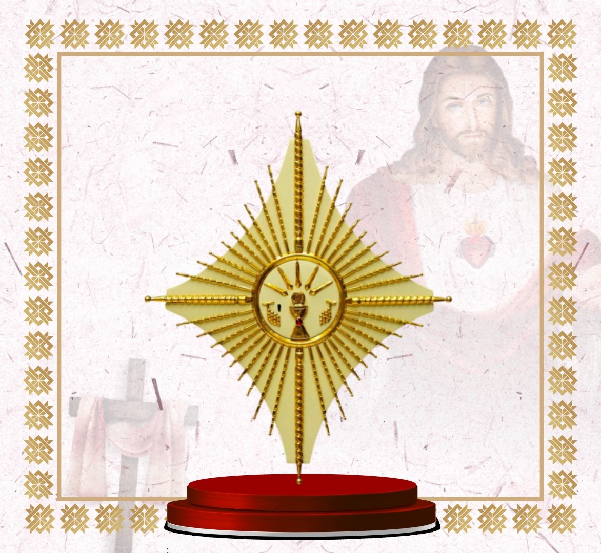 This monstrance is exquisitely designed in a radiant diamond-shaped rayburst form, symbolizing the light of Christ shining forth from the Eucharist. Crafted from high-quality brass and finished with rich gold plating, it features a central circular luna holder adorned with sacred Eucharistic symbols — the chalice, host, and rays of divine light. Ideal for Eucharistic Adoration, Benediction, and processions, this monstrance offers both striking beauty and deep liturgical meaning, making it suitable for parish and cathedral use.