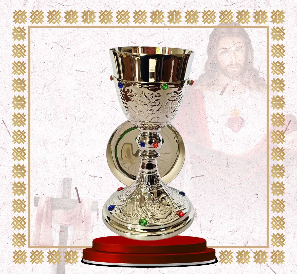 This magnificent silver chalice radiates sacred elegance with its intricate vine engravings and jewel-studded accents. Crafted from premium liturgical metal, the polished silver finish complements the vibrant stones that symbolize the diversity and unity of faith. Designed for durability and reverence, it enhances the beauty of the altar and enriches the Eucharistic experience.