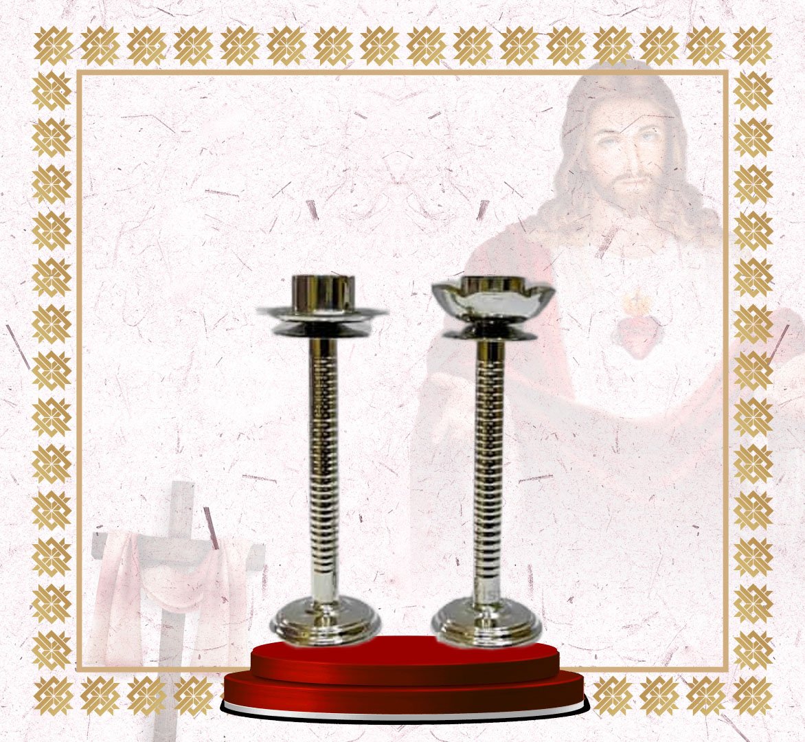 This elegant pair of candle stands is designed for church altars, chapels, and devotional spaces. The tall, ribbed stems and smooth circular bases provide a perfect balance of grace and stability. Each stand is finished in polished silver plating, reflecting the light of the candles beautifully during Mass or prayer services. Ideal for holding standard altar candles, these pieces symbolize illumination and divine presence, making them both practical and sacred elements of liturgical décor.